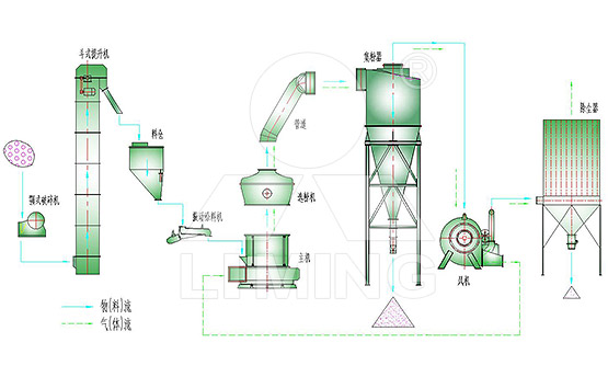 儲存在原料庫中的物料,經(jīng)破碎機破碎后通過提升機提至調節(jié)料倉,再經(jīng)電磁振動給料機送入歐版磨主機內(nèi)進行粉磨,在此環(huán)節(jié)除鐵器將含鐵異物排除,確保主機內(nèi)部正常運作。物料在磨粉機內(nèi)部通過磨輥和磨環(huán)的相互碾壓、研磨而被粉碎,粉碎后的物料在風力的作用下吹向選粉機進行分選,分選后的合格物料經(jīng)管道進入旋風集粉器收集,經(jīng)卸料閥輸出即為成品,未達到細度要求的物料重新回到主機再次研磨,粉磨后的成品通過提升機提至成品料罐儲存。
