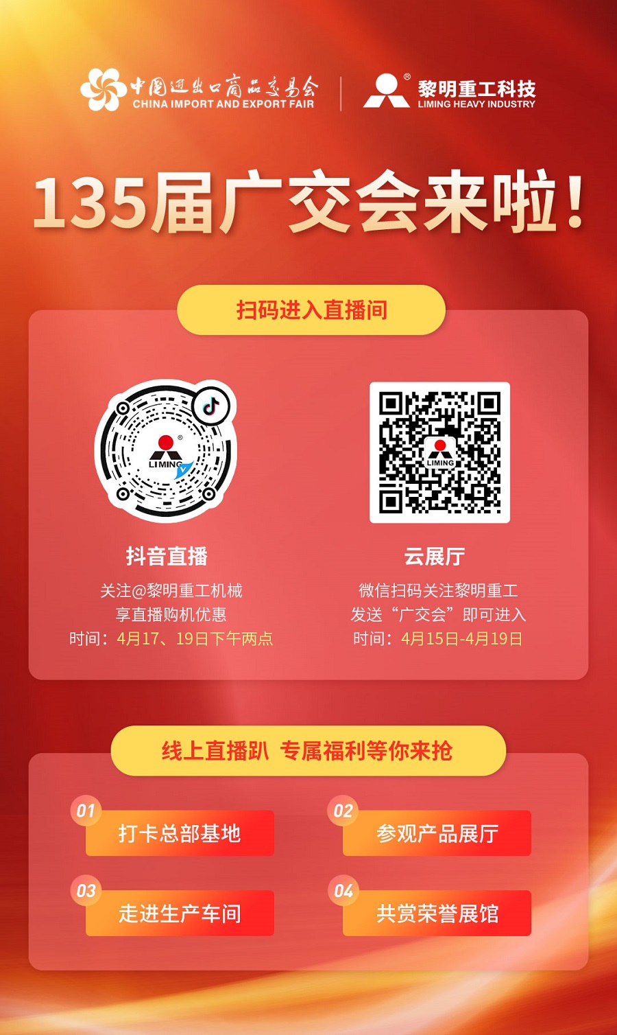 4月15日-19日,登陸黎明重工專屬的云展廳全方位地欣賞我們的產品,4月17日、4月19日下午2點抖音直播,15-19日廣交會全程每日直播,掃描上方二維碼關注我們,廣交會與您全線交流,敬請期待!